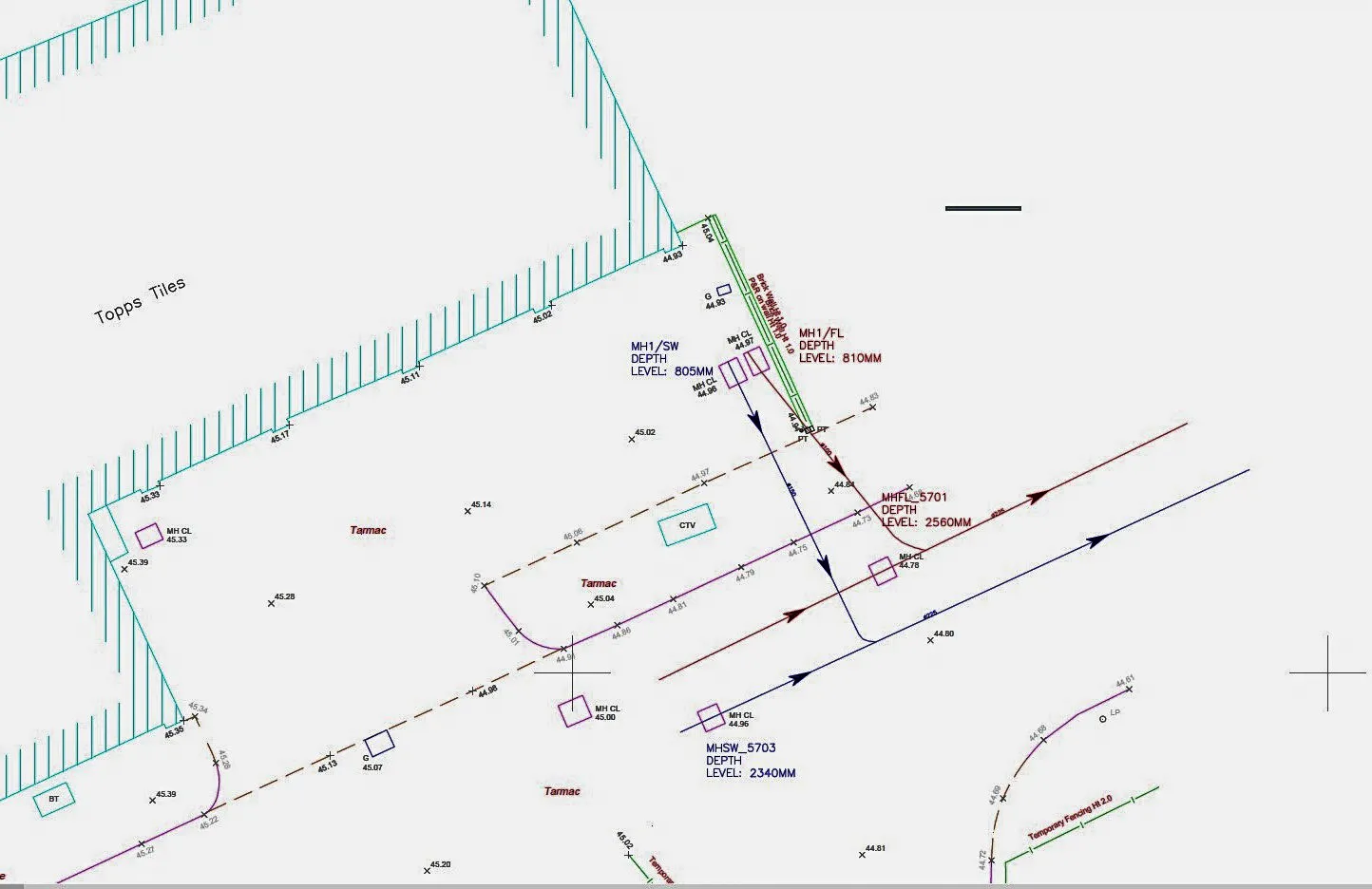 Pipe Location and Depth: The exact position of all foul and surface water drains, preventing accidental damage during construction or landscaping.